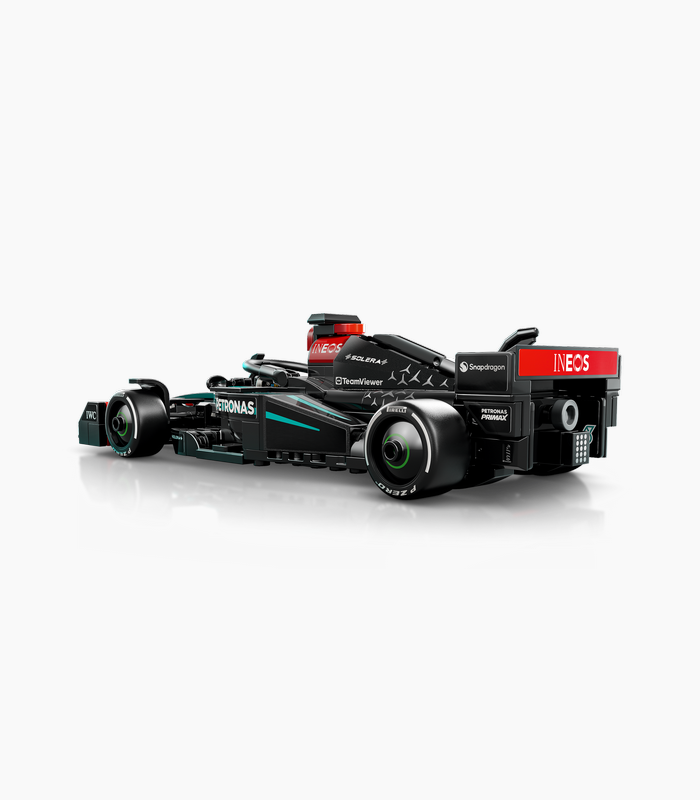 Unique Black and Silver color combination: The most impressive aspect of the model is how LEGO recreates the W15's gradient paint scheme: from a luxurious silver nose gradually transitioning to a mysterious black body, accented by a striking Petronas turquoise stripe running along the side. 🎨