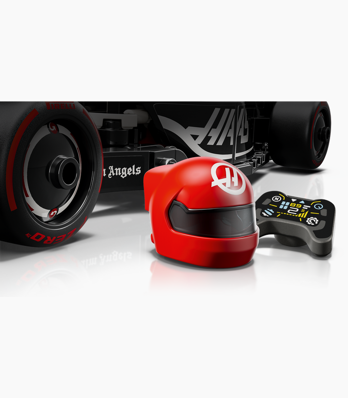 Haas racer minifigure: Included is a racer character (represented by Nico Hülkenberg or Kevin Magnussen) in a simple yet professional black and white racing suit, complete with helmet. 👨🚀