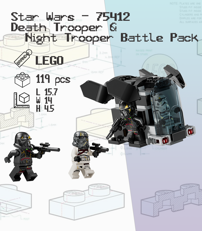 Bộ Battle Pack 75412 cho phép bạn mở rộng đội quân Đế chế với hai chủng lính đặc biệt: Death Trooper tinh nhuệ và Night Trooper huyền bí. Đây là set lý tưởng để tái hiện các trận chiến trong vũ trụ Star Wars.