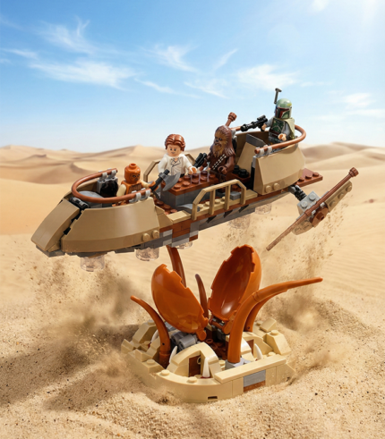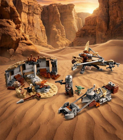 Trở lại sa mạc Tatooine nóng bỏng với LEGO Star Wars - Trouble on Tatooine. Bộ lắp ráp 276 mảnh ghép này tái hiện phân cảnh The Mandalorian hợp tác cùng người Tusken trong Season 2, đi kèm chiếc xe Speeder Bike cực ngầu, lều trại và 3 nhân vật: Mando (giáp Beskar), The Child (Grogu) và Tusken Raider.